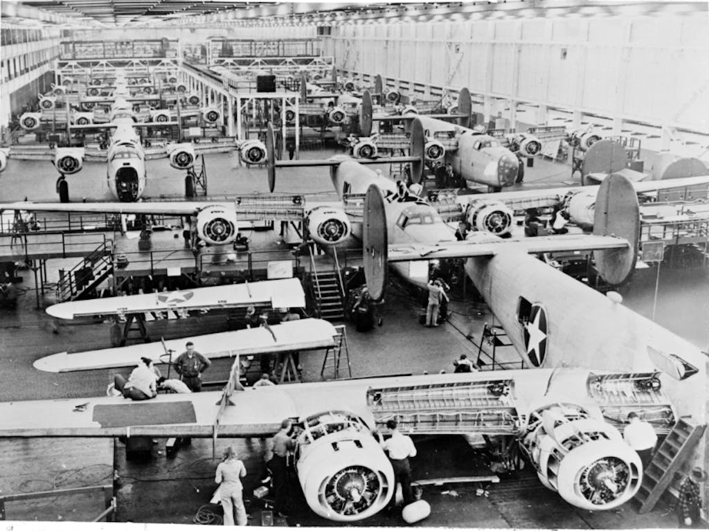 There were significant manufacturing marvels accomplished by the U.S. during wartime: tanks, amphibious trucks, four-wheel-drive troop transporters, flame-throwing armored cars, and jeeps—but military aircraft production has been hailed as the true gold standard for what our country could do when it mattered the most. Willow Run, the plant created specifically by Ford for the production of B-24 Bombers, could build one per hour by the summer of 1944. It used to take an entire month.