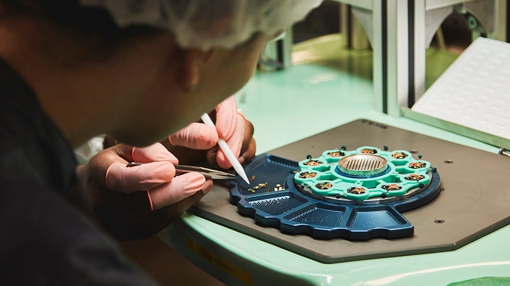 The team on the line works from circular trays or “magazines.” Each magazine houses 10 movements and the press of a pedal helps you navigate from one to the other and so on and so forth.