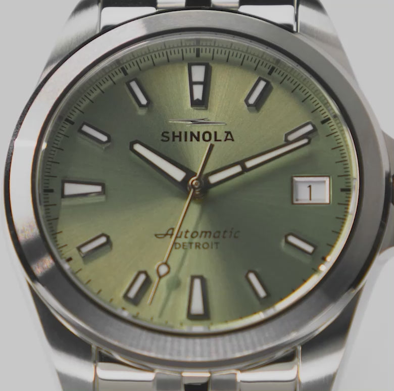 Extraordinarily elegant, this sandblasted sunray eucalyptus dial elevates every moment. Signature Shinola Monster indices and hands with Super-LumiNova lum complete the look.